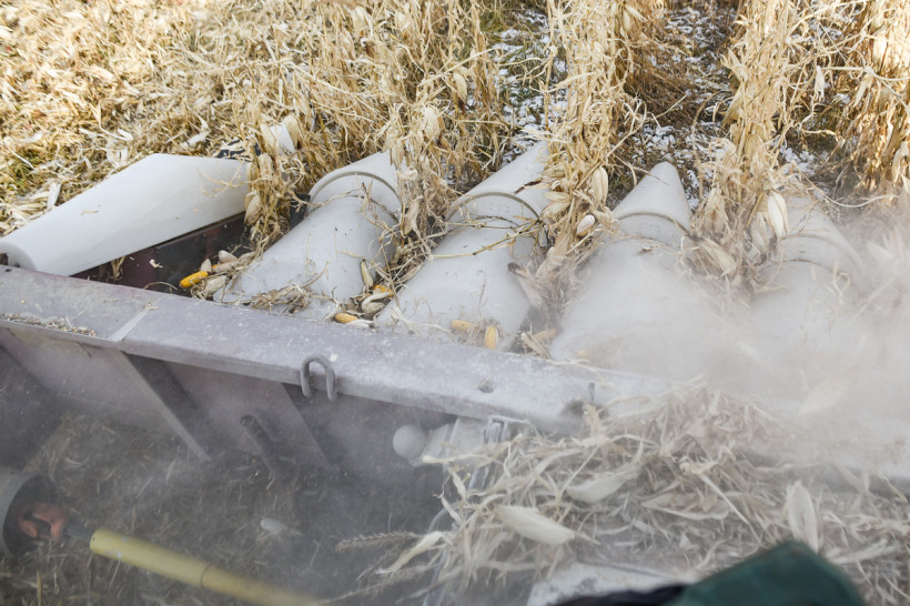 Белорусские комбайны «Палессе» с похожими на широкие стрелы жатками бодро бегают по кукурузному полю. Это специальные жатки, предназначенные именно для уборки кукурузы. Снизу спрятаны лезвия, которые срезают стебель, специальный механизм «забирает» его внутрь через специальное окошко. В барабанах отделяются листья, а также обмолачивается само зерно, которое заполняет бункер. Пока комбайн идет по полю, из кустов кукурузы то тут, то там взлетают ввысь фазаны — любители полакомиться сладким зерном. На полях металлический «работник» оставляет за собой измельченные остатки стебля и пустые початки, которые выдувает обратно из комбайна.