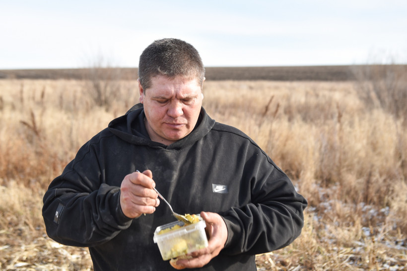 Уборочная идет без остановок — дневная смена сменится ночной — и даже обедают работники прямо в полях, куда бригадиры привезли горячую картошку с мясом.