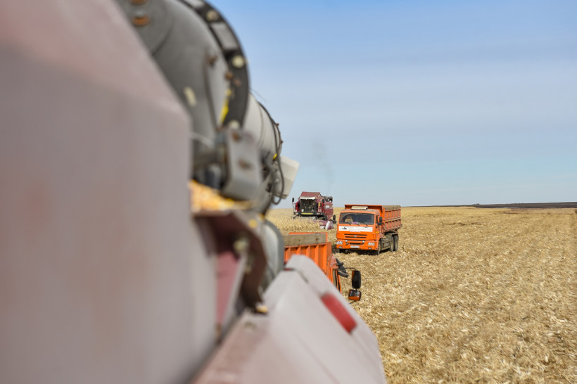 Буквально один проход — и на кабине оранжевым огоньком начинает «подмигивать» маячок. Это сигнал стоящим рядом КамАЗам о том, что бункер комбайна наполнился золотым зерном и его пора ссыпать. Порядка шести тонн кукурузы «сливается» в кузов, и комбайн продолжает работу. КамАЗ же увозит урожай на базу, там зерно ждет обработка и сортировка.