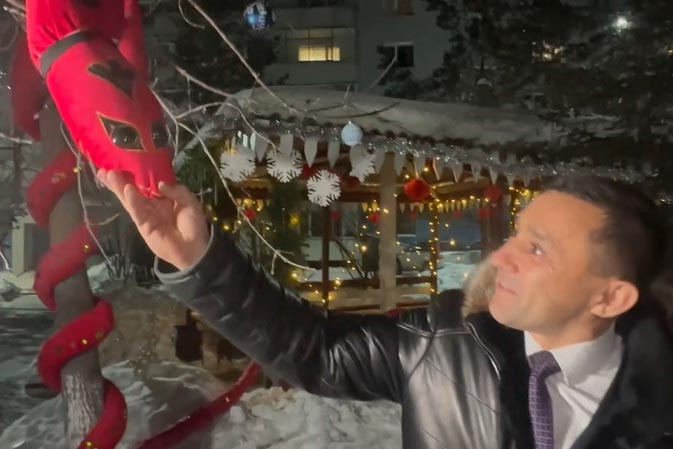 Градоначальник не скрывал эмоций, когда ему показали красавицу-елку, украшенную в советском стиле игрушками и мишурой, бурого медведя — символа России — в шапке-ушанке, с шарфом, в валенках и с балалайкой.