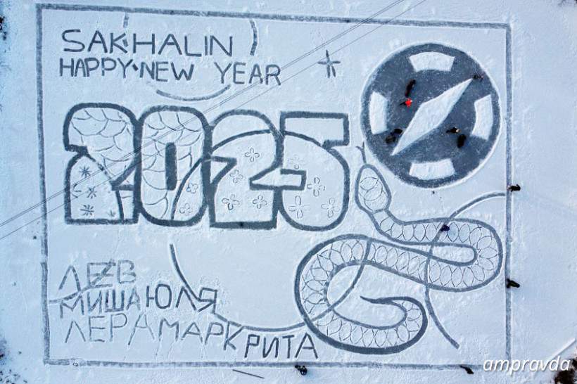 Для сахалинцев творческий процесс уже любимый. В этом году в создании открытки участвовали ребята от 9 до 15 лет, помогали родители. Всего на лед вышли около 15 человек. На ледовой открытке появилась надпись, цифры «2025», компас — как знак спортивного ориентирования, а также символ наступающего года — змея с идеальными чешуйками. Под финал работы некоторые ребята успели оставить свои имена на большом полотне: размер открытки вышел 40 на 30 метров.