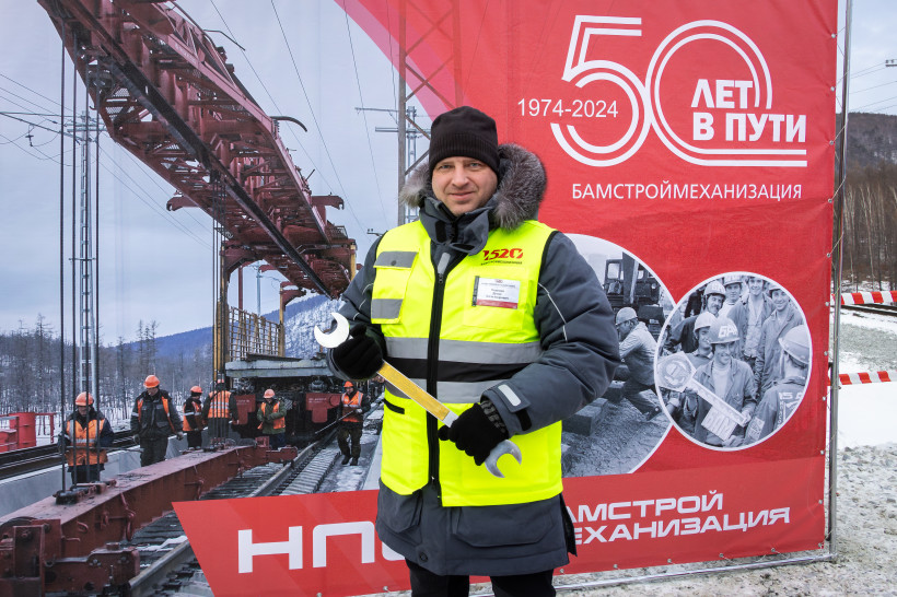 В юбилейный год Байкало-Амурской магистрали железнодорожные строители побили рекорд по скорости укладки путей, кото- рый считался лучшим результатом на про- тяжении сорока лет! В 1984 году на отрезке Таксимо — Витим бригада Героя Соцтруда Александра Бондаря за сутки уложила 5,4 километра рельсошпальной решетки. В 2024-м на перегоне от станции Тында до разъезда Побожий за сутки было уложено 8,1 километра путей. Причем рекорд поставили 27 октября — в этот день 40 лет назад было открыто рабочее движение поездов на всем протяжении магистрали. — Укладкой рельсошпальной решетки конкретно занимаемся не мы, но мы построили всё, на что ее нужно уложить. Вся техника, которая задействована при укладке рельсошпальной решетки, — бульдозеры, экскаваторы — наши. Земполотно, искусственные сооружения — мосты и водопропускные трубы под железнодорожными путями — тоже готовились силами наших структурных подразделений, — пояснил Денис Александрович.
