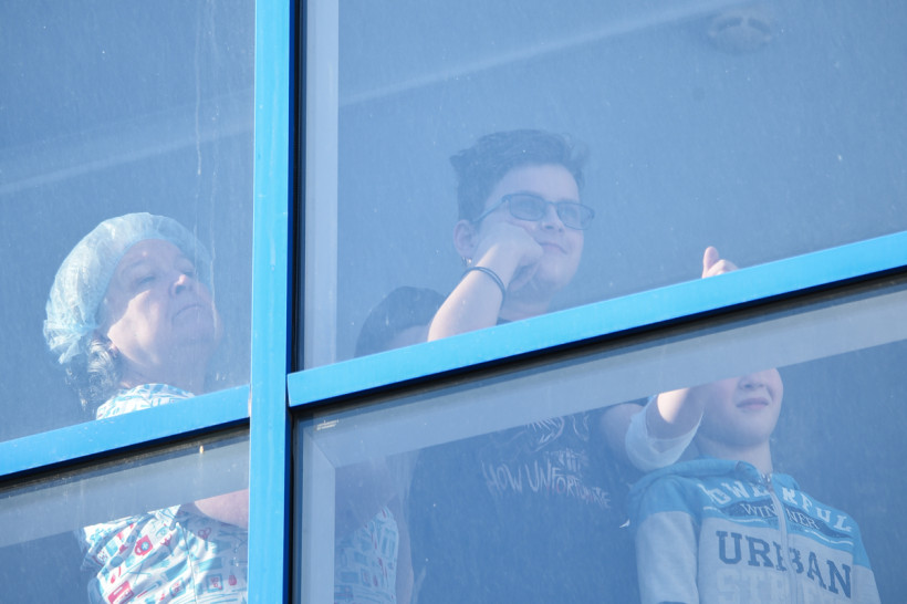 А в это время в отделении кардиологии маленькие пациенты и весь персонал примкнули к окнам.