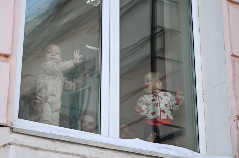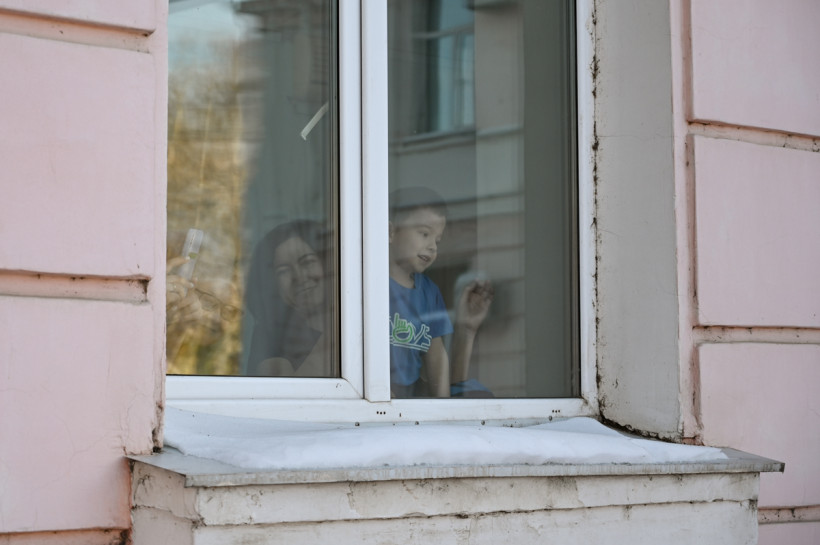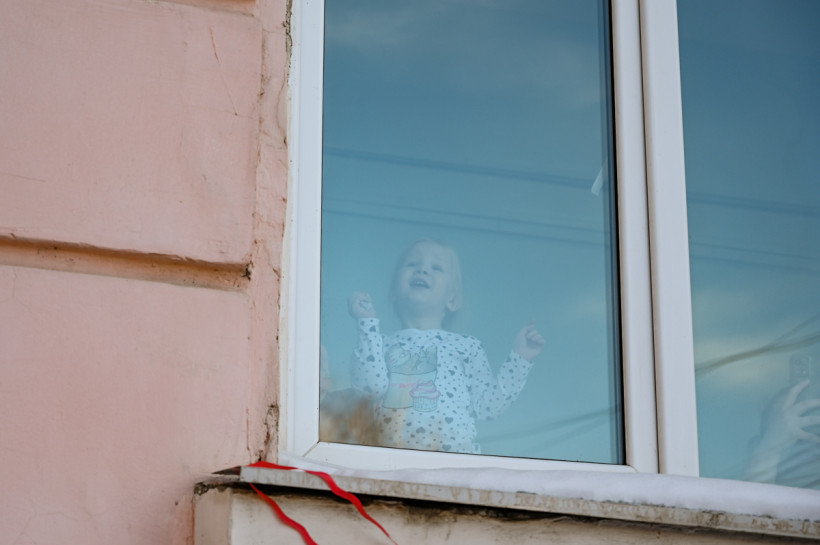 Восьмилетняя Сабрина из Белогорска удивленно смотрит на Деда Мороза, который плавно проплывает мимо больничных окон. Они в отделении вместе с мамой: та заботливо снимает дочь с подоконника и садит в кресло-каталку.