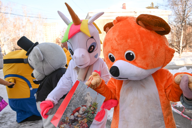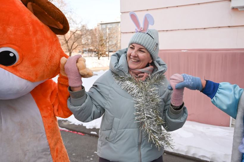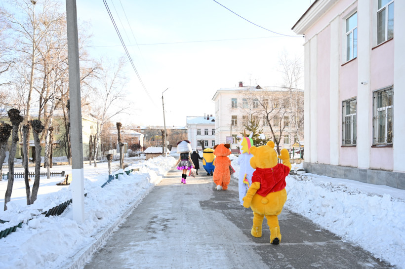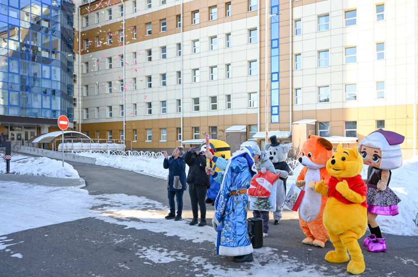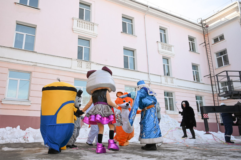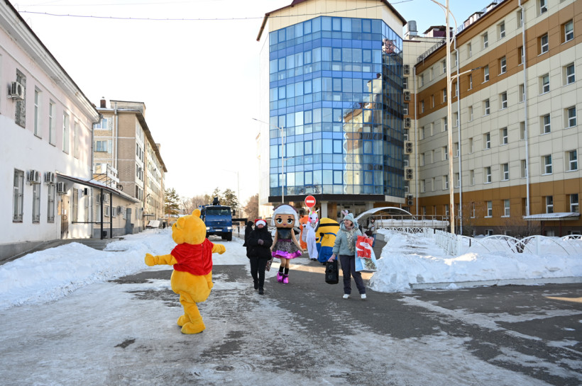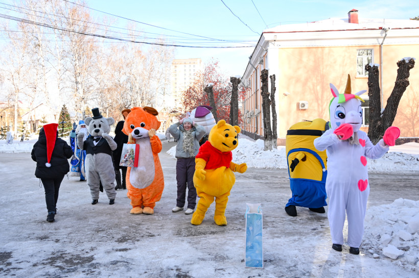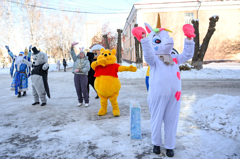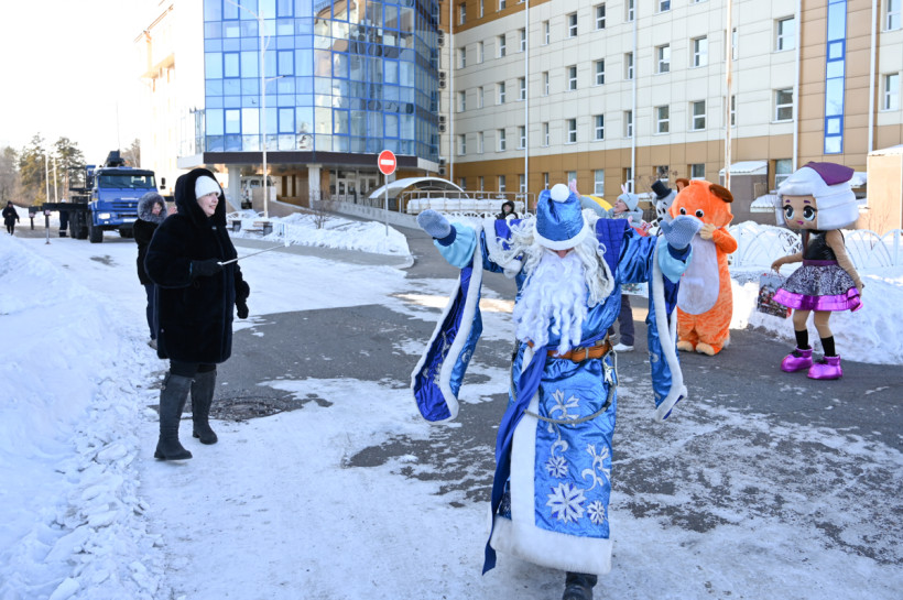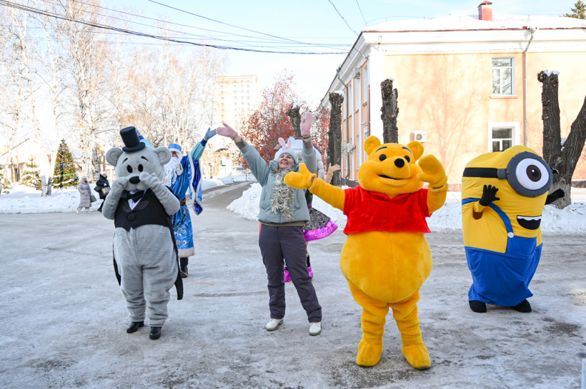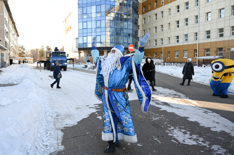 Под новогодние песни они начинают танцевать около хирургического корпуса. К большим окнам уже «прилипли» пациенты и медперсонал. Они с улыбками машут сказочным гостям и снимают видео на телефоны, а самые маленькие радостно подпрыгивают, завидев волшебную команду.