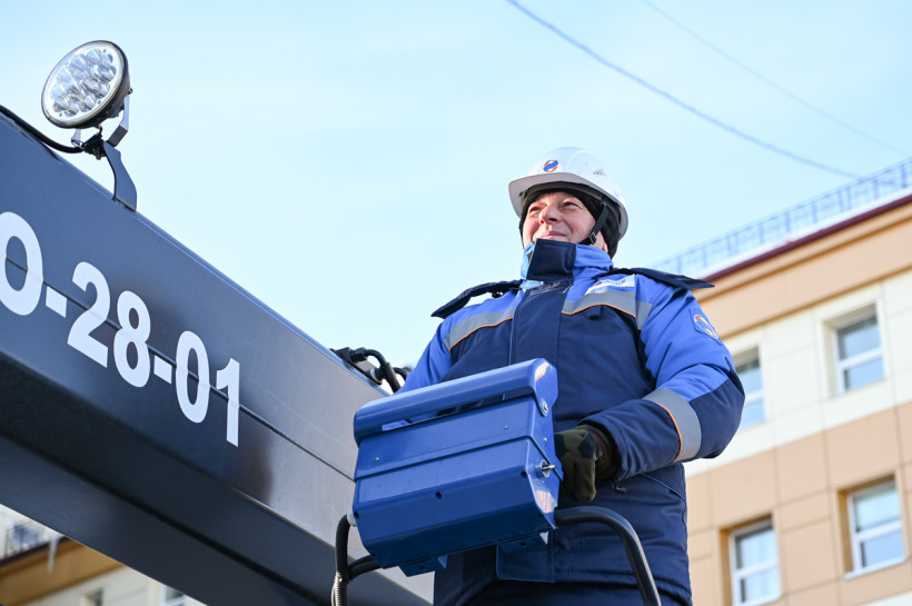 Тем временем электромонтер облачается в нарядную шубу, а под пояс Деда Мороза прячем страховочный пояс, которым он надежно будет прикреплен к люльке вышки.