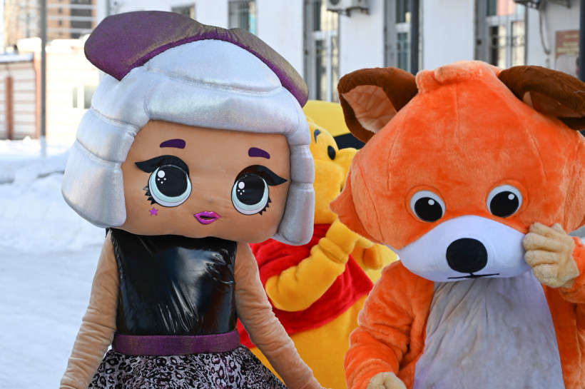 Дружная команда «выкатывается» на улицу под музыку — в громоздких ростовых костюмах шевелиться трудно, а нужно весело прыгать.
