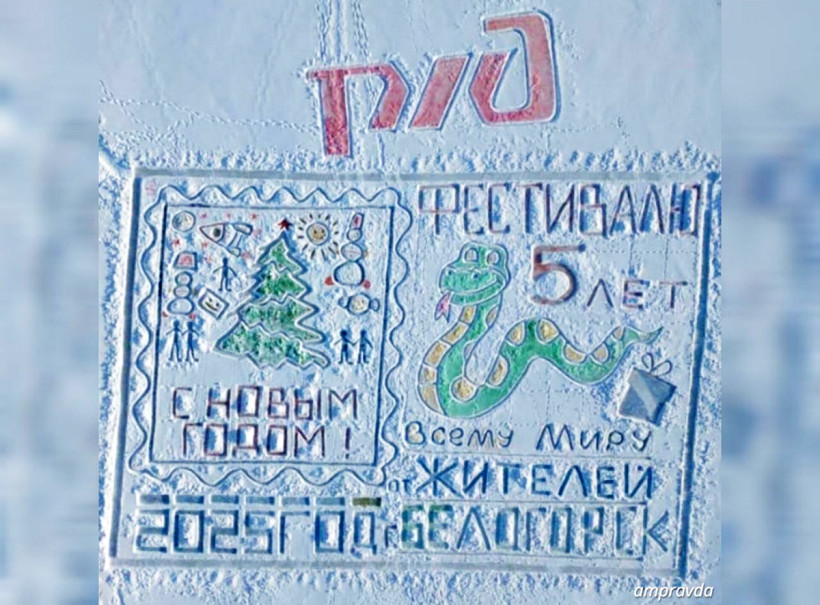 — Мы хотели нарисовать именно открытку, которую можно отправить по почте, то есть сделать отсылку к настоящей открытке. А также в юбилейный год фестиваля «Чудеса на льду» отдать дань памяти первому художнику Валерию Мельникову. Именно он — идейный вдохновитель для всех, кто каждый год выходит на лед водоемов и рисует свои картины, — рассказал Юрий Артемьев. — Идею эту обсуждали в группе с постоянными участниками, в итоге она оформилась в этот эскиз. В свободной части почтовой открытки — отсылка к работе Валерия Мельникова, взяли за основу его рисунок на Хомутине: елочка, фигурки вокруг. Добавили символ 2025 года — Змею. Долго думали, кому адресовать открытку, и все-таки решили, что это поздравление всему миру от жителей Белогорска.