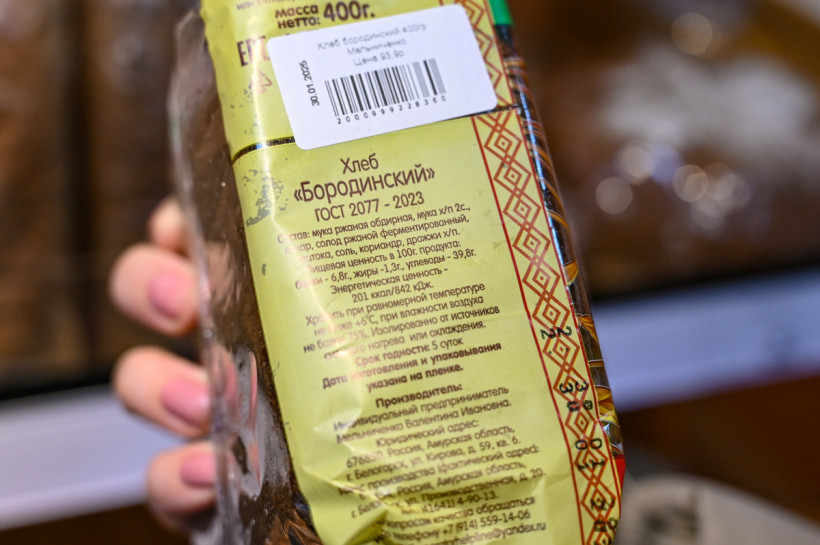 Для примера: хлеб «Здоровье» весом в 400 граммов от «Амурского хлебушка» стоит почти 62 рубля, а «Бородинский» от «Серышевского» (ИП Мельниченко) обойдется в 93 рубля — на упаковке указан ГОСТ, по которому изготовлен хлеб.