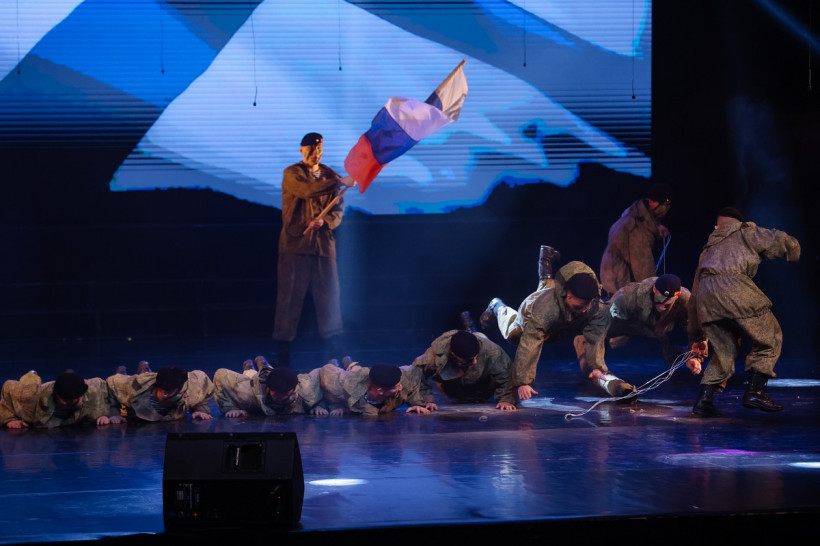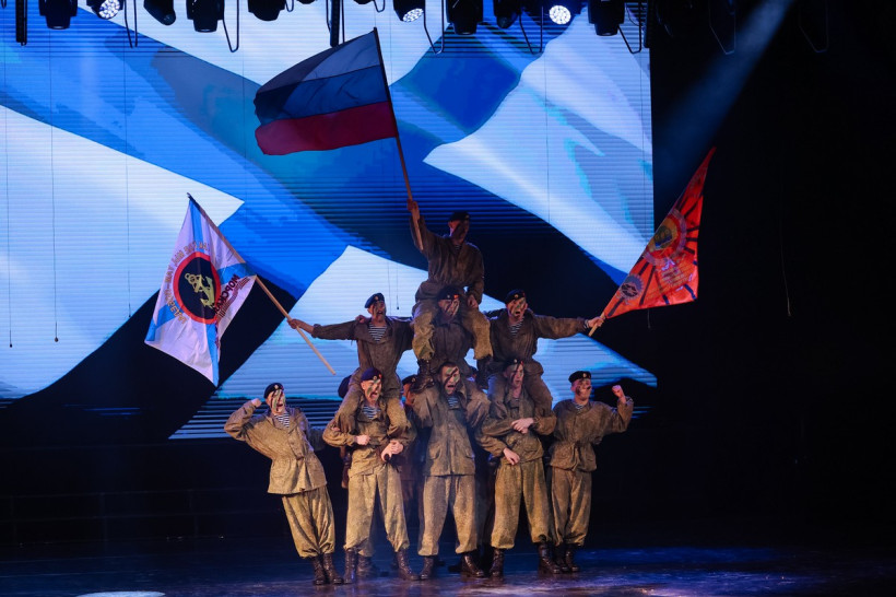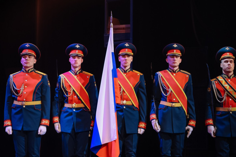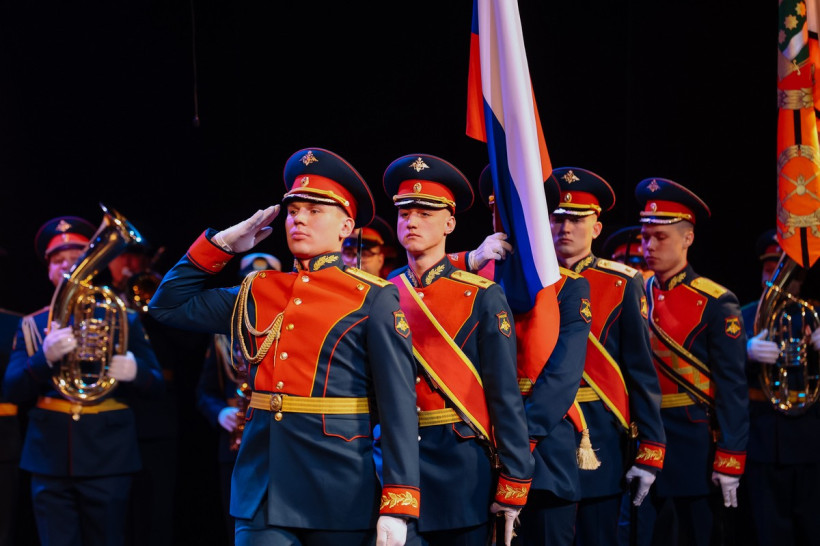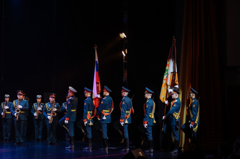 Церемония началась с торжественного выноса Государственного флага РФ и боевого знамени училища — под военный марш оркестра ДВОКУ. Огромный зал ОКЦ встречал этот момент стоя.