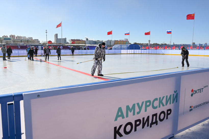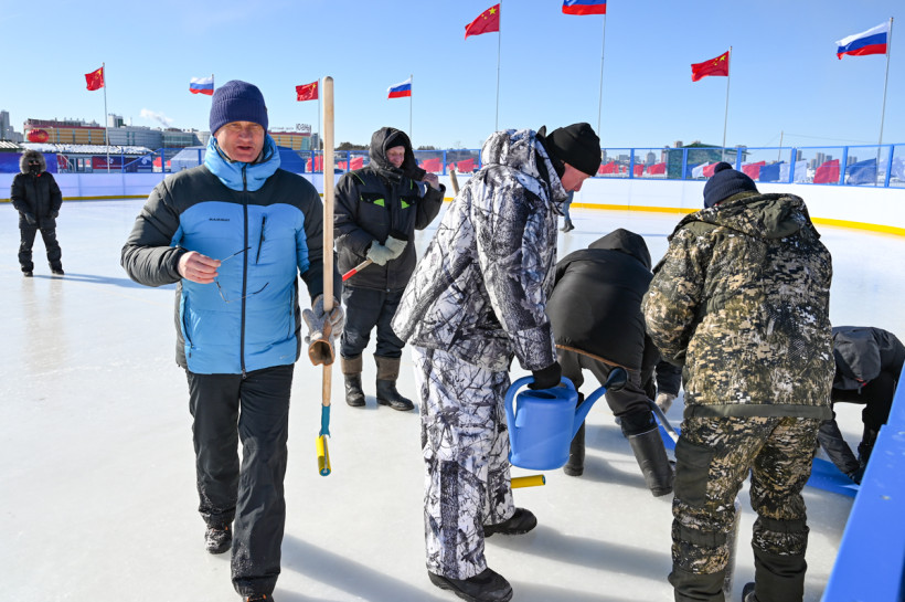 В это время на хоккейной коробке команда сотрудников спортивных учреждений Приамурья и ГСТК с щетками, лейками и огромными тросами наносят разметку на лед. Работа ювелирная, но на льду всегда есть место творчеству: одни командуют лейками, другие бодро орудуют валиками и метелками.