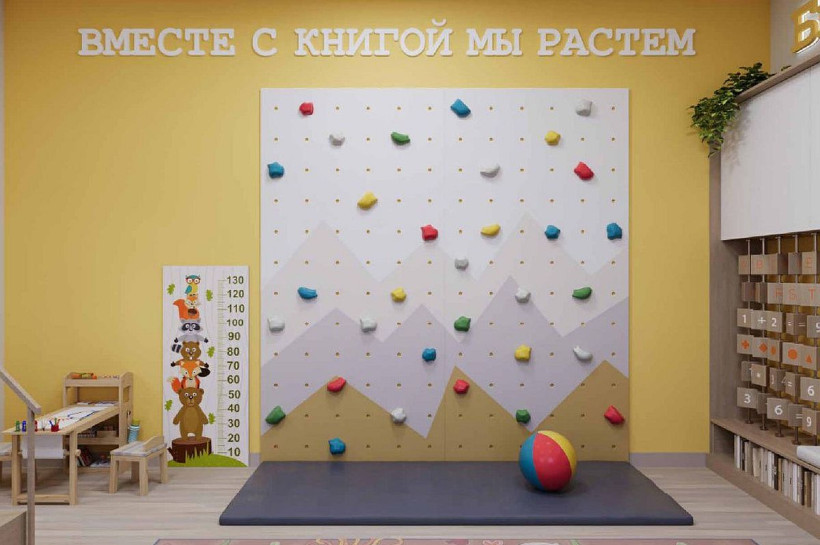 - детская зона с низкими стеллажами для книг, стендами-бизибордами и столиками для творчества;