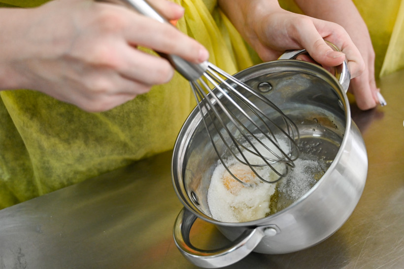 — Яйца, сахар, соль и молоко нужно соединить с мукой, но, чтобы тесто было без комочков, сначала добавить половину молока, а после того как пробили комочки, долить оставшееся, — поясняет преподаватель. — Потом растопим сливочное масло и выльем в тесто, а затем добавим мак.