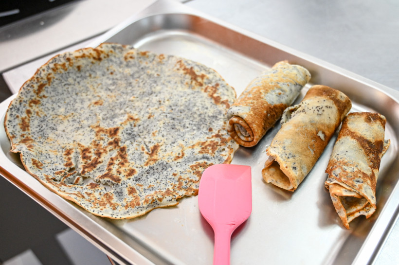 — Блинчики — одно из древнейших мучных изделий. Если блины выпекаются из дрожжевого теста, по консистенции напоминающего сметану, то блинчики делают на молоке или воде без дрожжевой закваски, поэтому тесто получается достаточно жидким. Блины обычно пышные, рыхлые и толстоватые, а блинчики – тонкие и почти прозрачные. Припёк – это начинка, которую добавляли в тесто, чтобы улучшить вкус и сделать блинчики более сытными. Чаще всего это были вареные яйца, овощи, тыква и грибы. Мы используем пищевой кондитерский мак, — говорит Яна Игоревна и интересуется: — Кто сам пёк блинчики дома?
