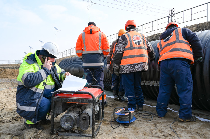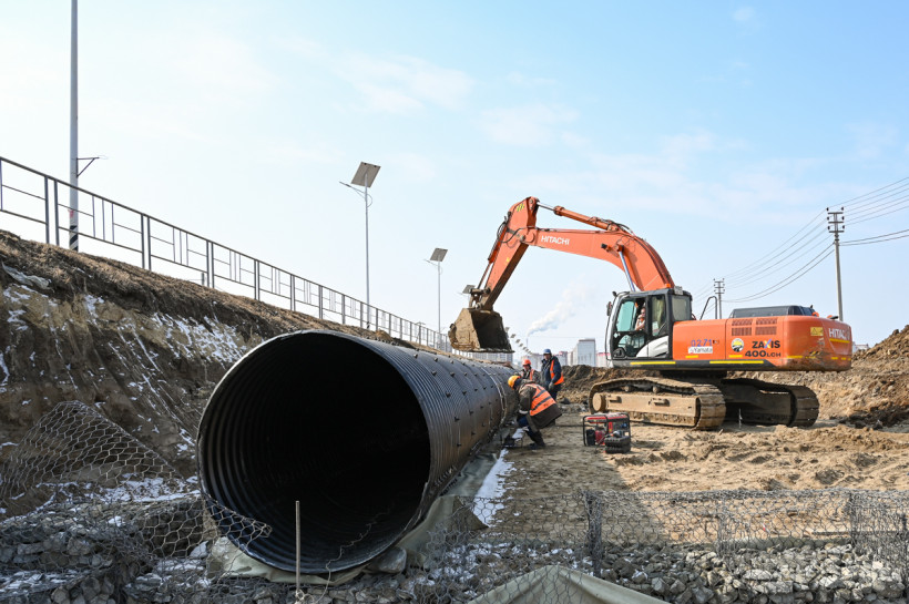 Для этого и нужно водопропускное сооружение — три больших трубы диаметром полтора метра и длиной более 20 метров каждая. Части этих труб изготовили в Новосибирске. Затем на своей базе в районе поселка Заречный под Благовещенском специалисты компании соединяли их в более крупные конструкции. А окончательную сборку и гидроизоляцию делают уже здесь, на стройплощадке возле Василенко.