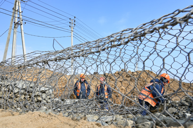 Параллельно работники «Асфальта» устанавливают портальные стенки из габионов (сетчатые кубы, внутри которых находятся камни). Они будут служить основанием для «подушки» под водопропускными трубами.