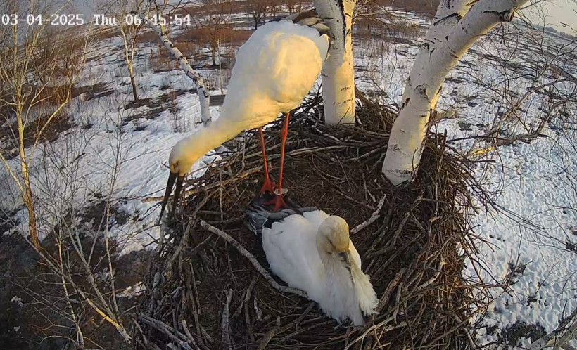 Дальневосточные аисты традиционно прилетают в Приамурье в двадцатых числах марта. В этом году пара из Березовского заказника, на гнезде которой установлена видеокамера, прилетела 24 марта — в ту же дату, что и в прошлом. Из-за прохладной погоды птицы пока не спешат обзаводиться потомством.