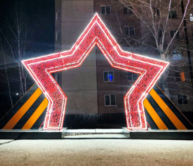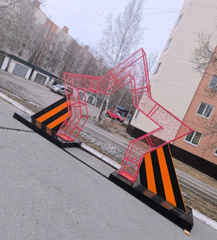 Автор нового арт-объекта — промышленный альпинист и кузнец, житель Тынды Константин Швец. Металлическая звезда в красном цвете, а её основы по бокам «облачились» в цвета георгиевской ленты.