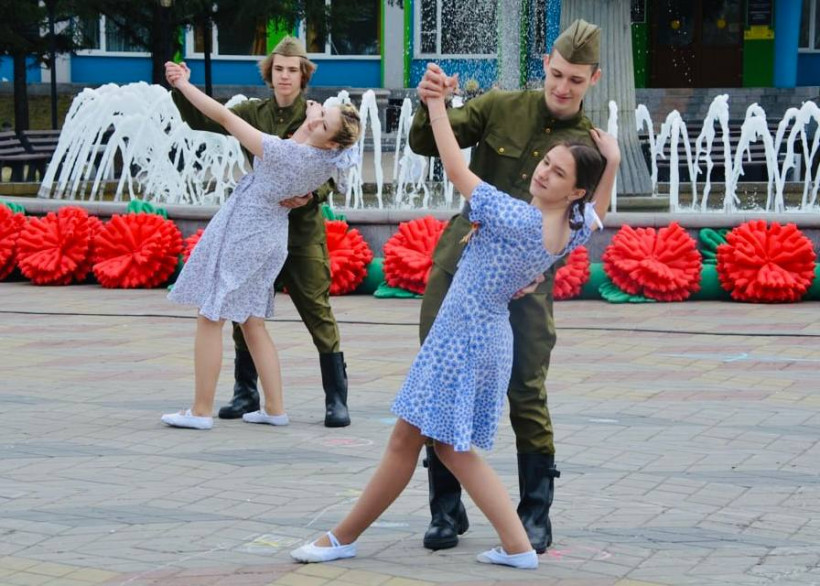 На центральной городской площади вальс под военные песни станцевали воспитанники 11 детсадов, ученики гимназии №1, школы №3, студенты Амурского колледжа сервиса и торговли, а также детский хореографический коллектив «Каприз», образцовый ансамбль эстрадного танца «Стиль», танцевальный спортклуб «Лира», танцевально-оздоровительные клубы «Ретро» и «Максимум», сообщили в мэрии Белогорска.