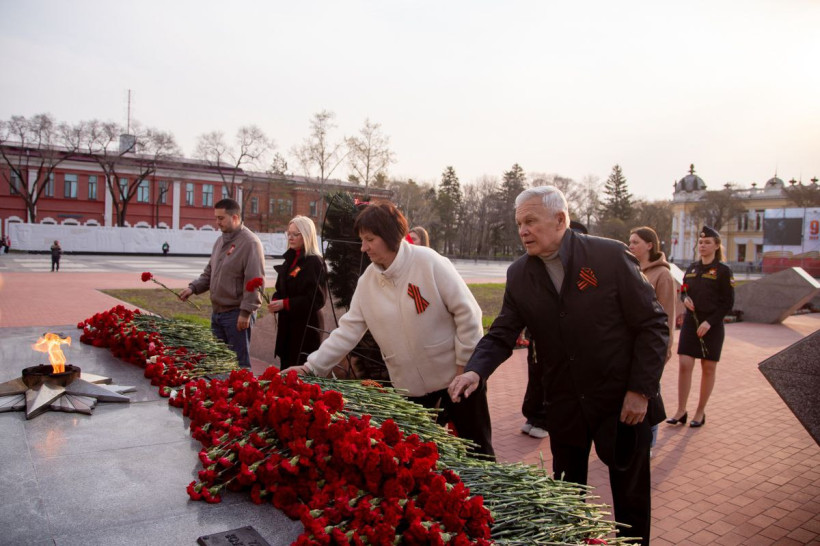Памятная акция завершилась возложением цветов к памятнику воинам-амурцам. 80 лет назад именно в 00:43 по московскому и в 6:43 по местному времени был подписан акт о безоговорочной капитуляции Германии. Настала долгожданная Победа!