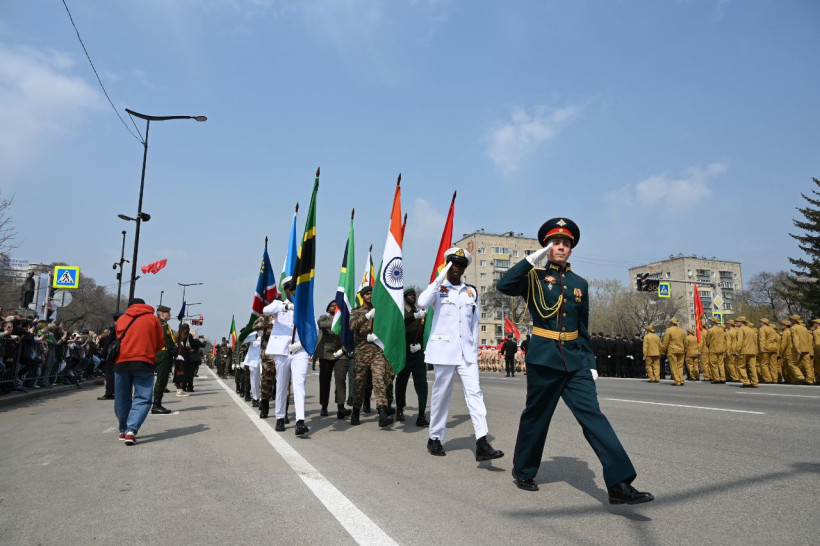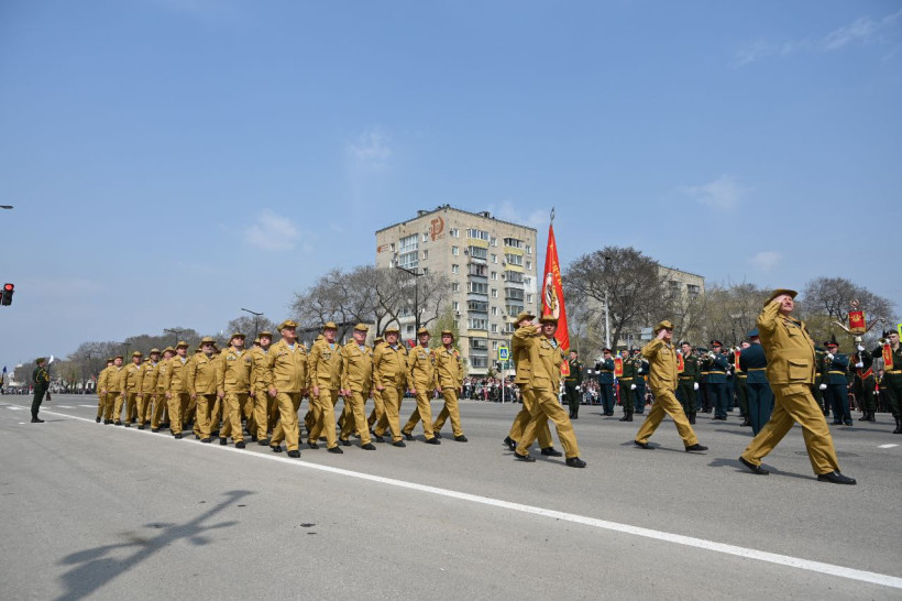 Открыли шествие юные барабанщики — учащиеся Амурского кадетского корпуса, основную часть участников торжественного прохождения составили курсанты ДВОКУ, в том числе курсанты-иностранцы, обучающиеся в училище. Впереди каждого парадного расчета иностранцев знаменная группа несла национальный флаг страны, а военнослужащие были одеты в форму Вооруженных сил своего государства, тем самым выразили свою солидарность в Победе советского народа в Великой Отечественной войне. Также к шествию подключились юнармейцы, сотрудники Пограничного управления ФСБ России, МЧС, полиции, судебные приставы, сотрудники службы исполнения наказаний, юные моряки, воспитанники и руководители военно-патриотических клубов, ветераны боевых действий, амурские казаки.