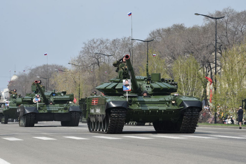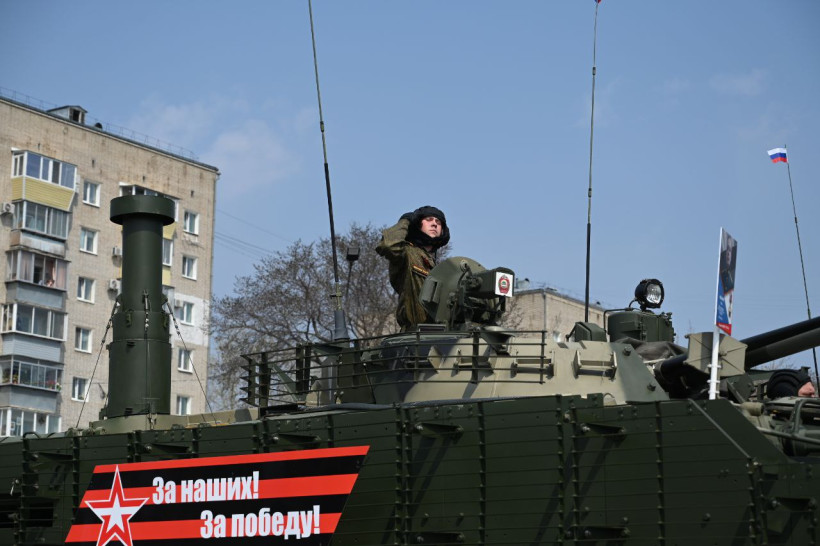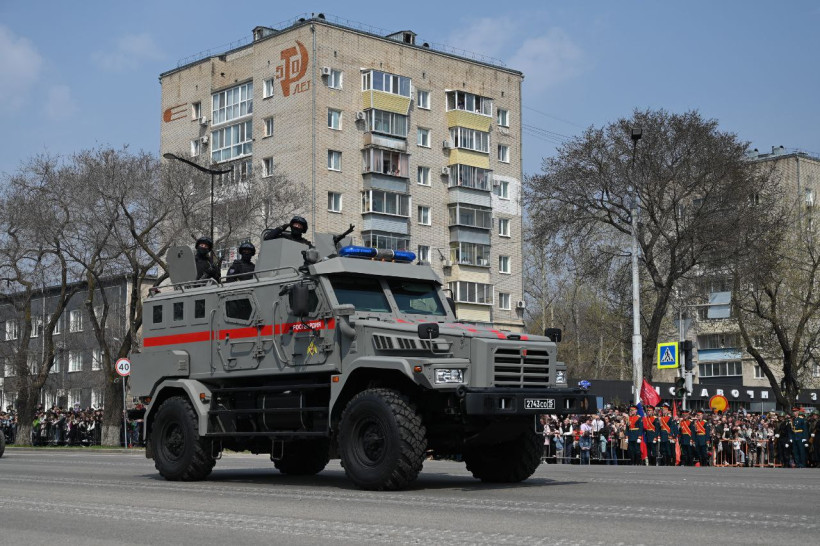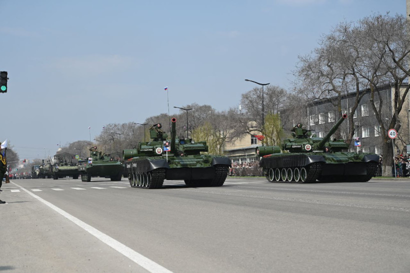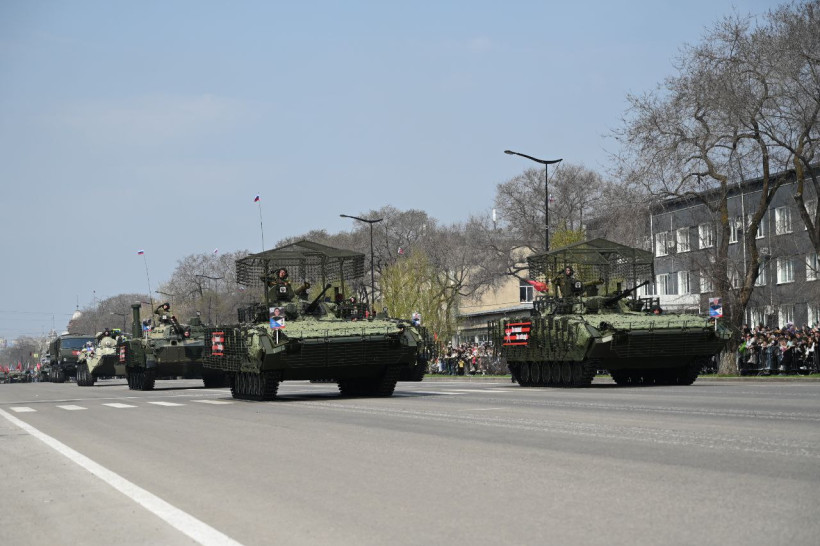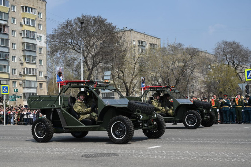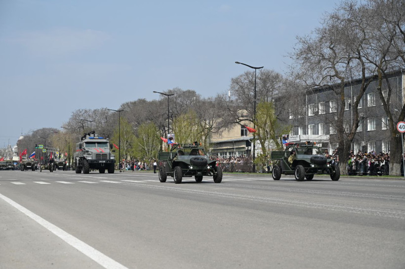 После прохождения пеших парадных расчетов гостям и жителям Благовещенска была представлена механизированной колонна ДВОКУ состоящая из 22 единиц военной техники. Открыл парад легендарный танк Великой Отечественной войны — Т-34 «Боевая подруга», который 80 лет назад, принимал участие в боях с фашистами в составе второго гвардейского Тацинского танкового корпуса. Также в составе колонн прошли армейские мотовездеходы АМ-1, боевые Т-72 Б3М, танки Т-80БВ с единой газотурбинной силовой установкой. Зрителям представили и БМП-2М с новейшей динамической защитой и противодронной сетью, БМП-3, бронетранспортер БТР-82А, 100 миллиметровую противотанковую пушку МТ-12 буксируемую трехосным КАМАЗом — 4320.