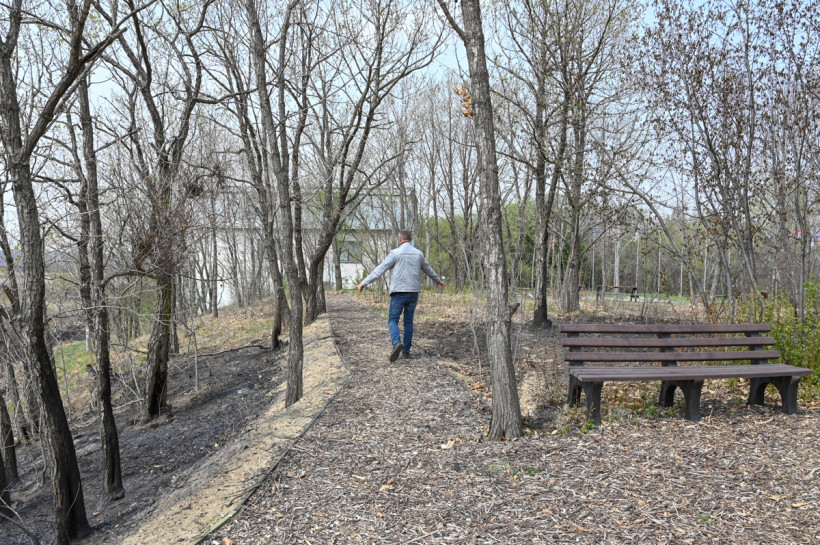 Выженная земля и опаленные огнем деревья — такая картина сейчас в парке. Фото: Алексей Сухушин