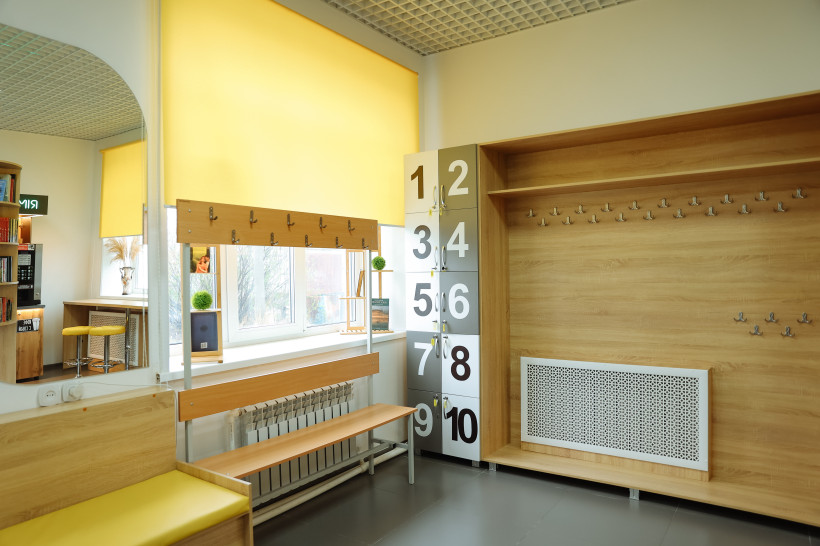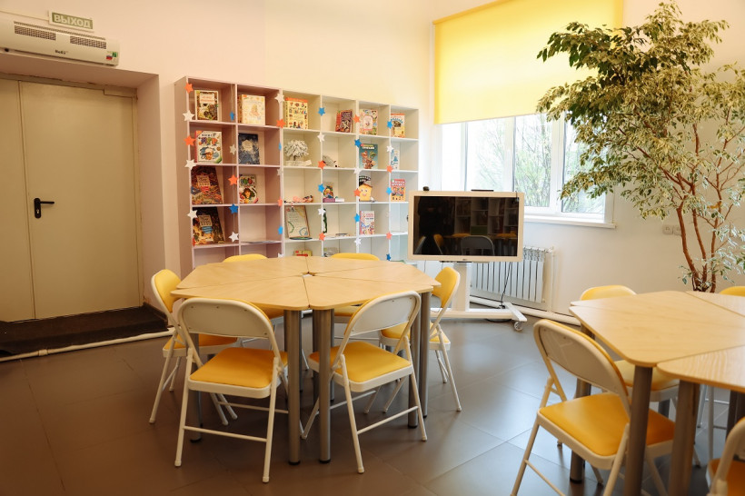 Рядом, за полками, расположена многофункциональная зона со столами и стульями, где можно собраться компанией или посидеть в одиночестве. Сюда дети приходят после уроков: кто-то делает домашнее задание, кто-то отдыхает за настольной игрой или с книгой.