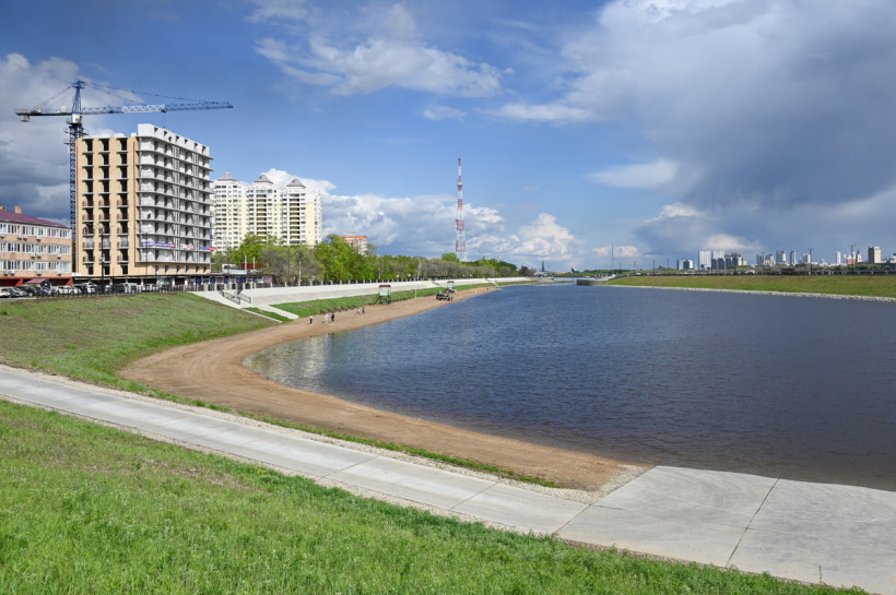Новый 500-метровый пляж можно найти сразу за телевышкой ОРТПЦ. Здесь установили вышки для спасателей и шезлонги для отдыхающих.