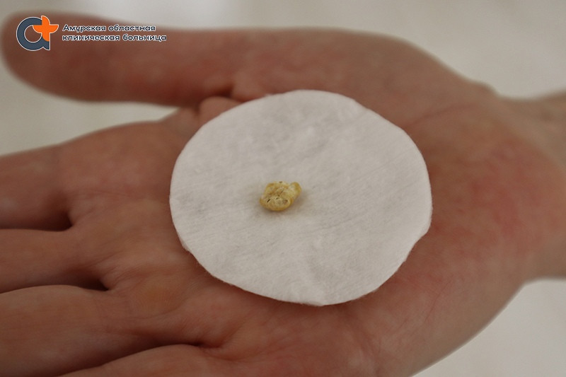 После госпитализации в отделении ЧЛХ не сразу смогли определить местоположение камня, но на очередном осмотре челюстно-лицевой хирург Вячеслав Ковальчук сумел найти его. Операция оказалась успешной — образование размером с кукурузное зерно врачи отдали пациентке на память.