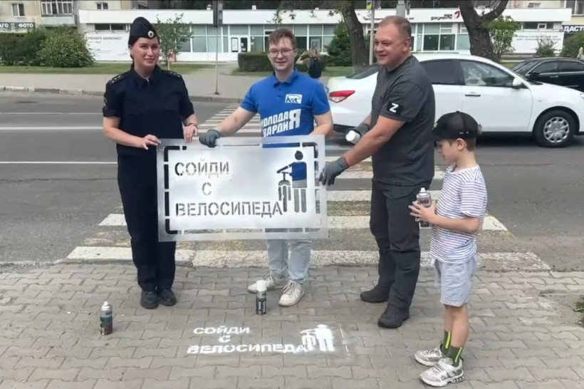 Активисты «Молодой Гвардии» и сотрудники Госавтоинспекции Приамурья провели акцию для повышения безопасности пешеходов и велосипедистов на дорогах Благовещенска. Они нанесли на тротуары надписи, которые призывают снять наушники, не отвлекаться на телефон и сойти с велосипеда при пересечении дороги.