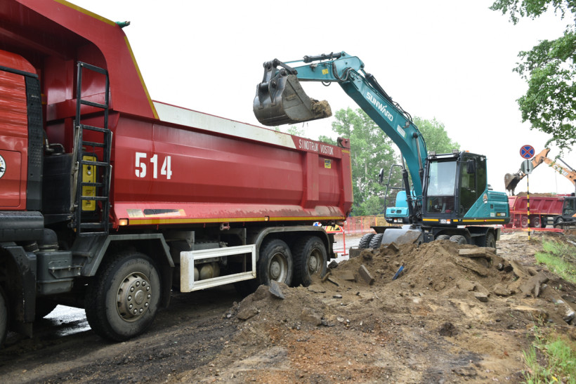 Машинист экскаватора Алексей Третьяк загружает в кузов демонтированные фрагменты старого дорожного покрытия. За первую половину дня его техника обработала двухсотметровый участок обочины.