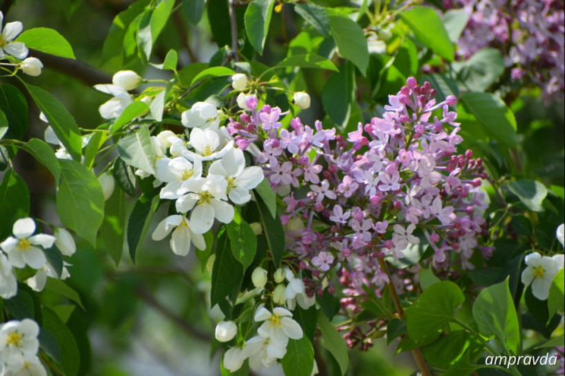 Дружба яблоньки и сирени в Февральске. Вот так переплелись своими ветвями белая яблонька и сиренево-фиолетовая сирень. Две неразлучницы. Автор: Ольга