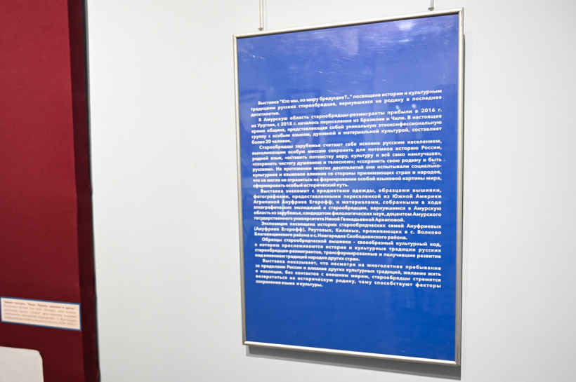 В Амурском областном краеведческом музее открылась уникальная выставка «Кто мы, по миру бредущие?», посвященная искусству старообрядческой вышивки. Ее главные герои — семьи, вернувшиеся в Россию после долгих лет жизни в Бразилии и Уругвае. В Амурскую область они привезли с собой не только память о предках, но и удивительные работы, в которых переплелись русские традиции и зарубежные мотивы.