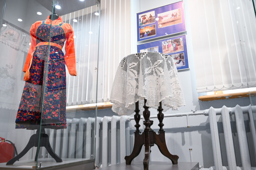 Исторические костюмы: сарафан, кофту, рубаху, сшитые с учетом традиций в начале прошлого века, — ажурные вязаные салфетки, скатерти и фотоархив Агрипина специально для выставки привезла из Бразилии. Фото: Алексей Сухушин