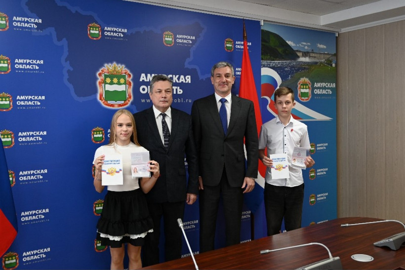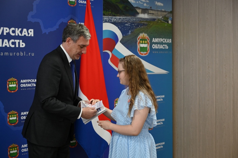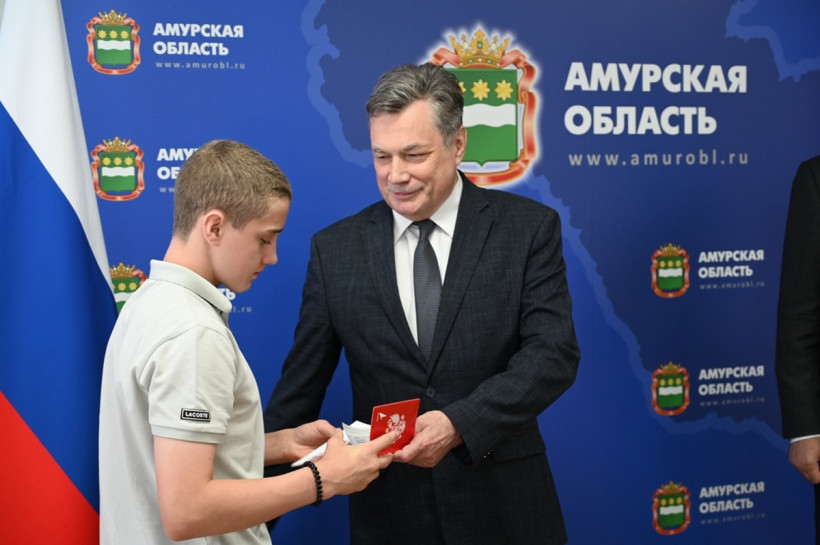 В преддверии Дня России губернатор Василий Орлов и главный федеральный инспектор по Амурской области аппарата полномочного представителя Президента Российской Федерации в ДФО Игорь Шипов вручили первые паспорта 11 амурским школьникам. Все эти ребята успешны в учебе, спорте и общественной жизни. Они — победители всероссийских соревнований, школьных и муниципальных олимпиад и конкурсов, волонтеры, общественники.