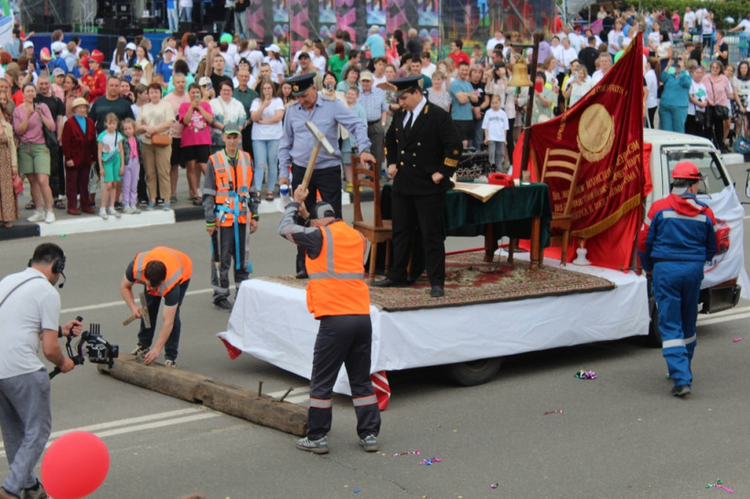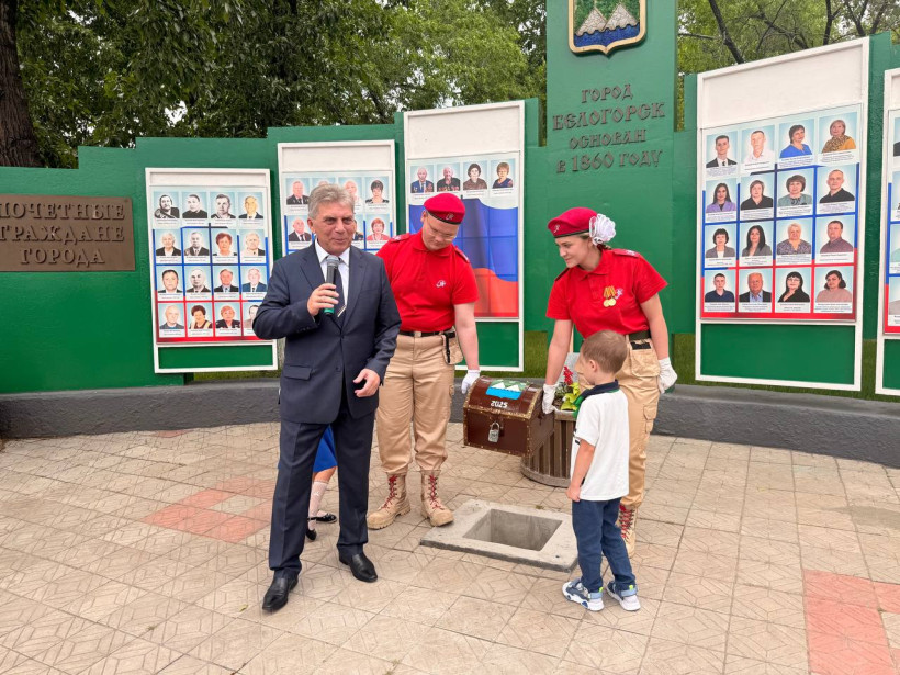 После Мария и Илья и пятилетние Ксения и Марк заложили капсулу времени в заранее подготовленное место у Доски почета, где установлена мемориальная табличка: «Капсула времени»: заложить 12.06.2025, вскрыть 12.06.2050».
