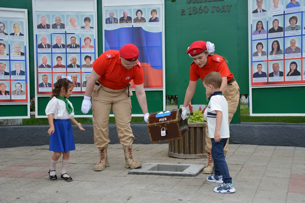 После Мария и Илья и пятилетние Ксения и Марк заложили капсулу времени в заранее подготовленное место у Доски почета, где установлена мемориальная табличка: «Капсула времени»: заложить 12.06.2025, вскрыть 12.06.2050».