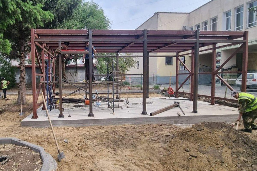 В готовом наполовину сквере Приемыхова в Благовещенске монтируют каркас будущего кафе «Катушка»