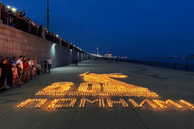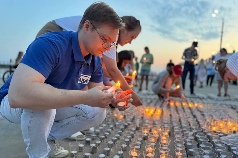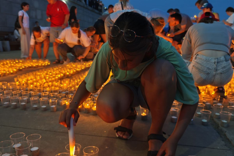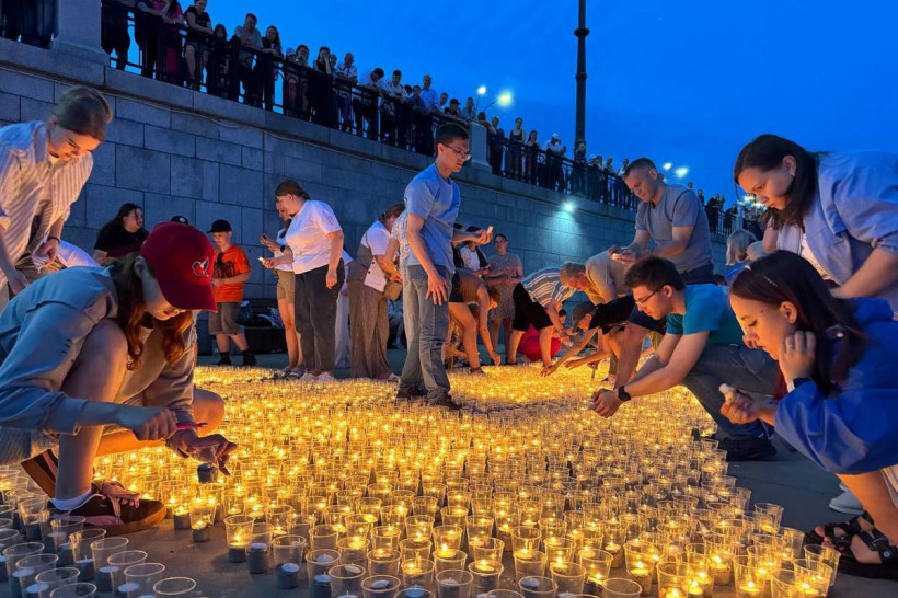 Официальный символ 80-летия Победы в Великой Отечественной войне появился в День памяти и скорби на берегу реки Амур в Благовещенске. Вечером 22 июня на нижнем ярусе набережной жители и гости областного центра свечами выложили изображение «Родины-матери». На то, чтобы в правильном порядке расставить пять тысяч свечей, у организаторов и участников акции ушло два часа, а еще около 30 минут — на то, чтобы зажечь все фитильки.