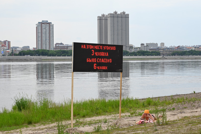 Не пустует и старый пляж. Загорающие располагаются прямо под баннерами, на которых красным по черному зафиксирована страшная статистика: «На этом месте утонуло три человека», «На этом месте утонул один человек».