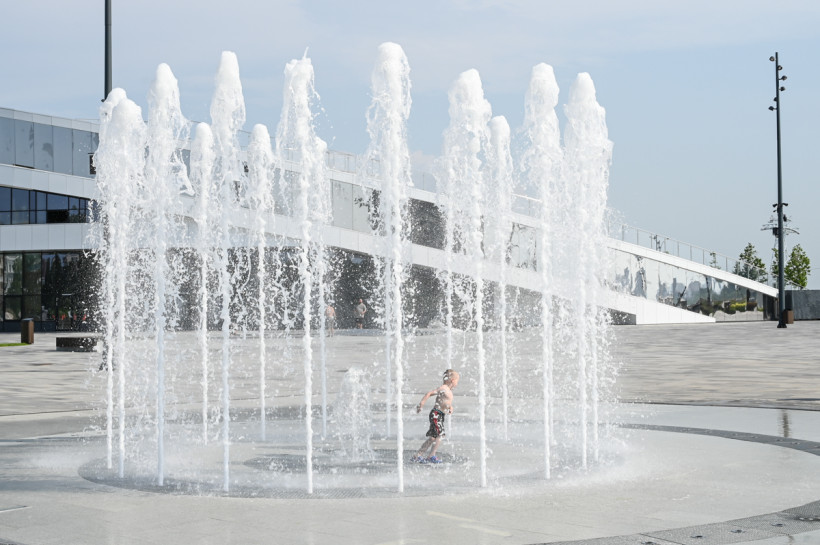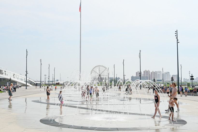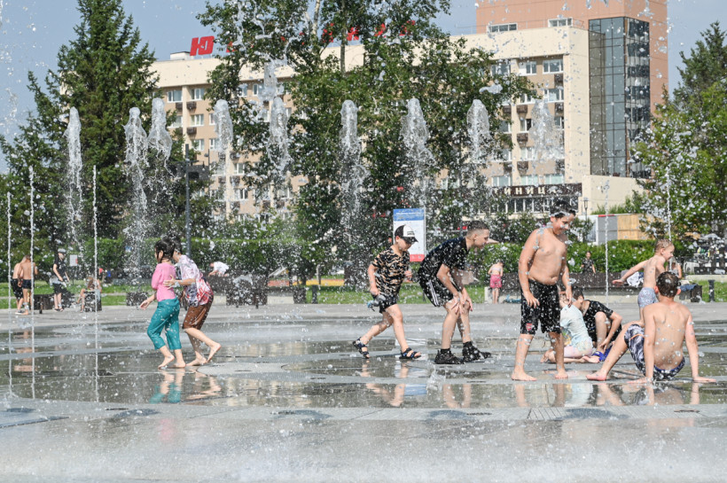 В центре города дети и подростки превратили пешеходный фонтан в настоящий аквапарк. Мальчишки в трусах и майках прыгают прямо под струи, девочки осторожно мочат ноги, мамы фотографируют.