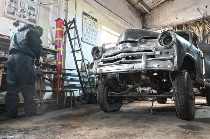 В механическом боксе мы увидели настоящий раритет — старинную «Победу», которую житель Приамурья купил еще полвека назад. ГАЗ М-72 прошел здесь полную реставрацию. Это советский полноприводный легковой автомобиль, которые серийно производили на Горьковском автомобильном заводе с 1955 по 1958 год. Их всего было выпущено 4 677 экземпляров в стране.