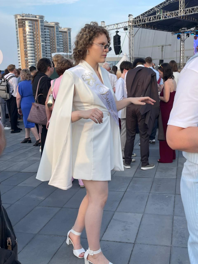 — Очень мне понравилась девушка в достаточно нетрадиционном для выпускного вечера костюме — жилете и брюках (такой отсыл к мужскому стилю). Но выпускница очень хорошо чувствует себя и свой внутренний мир — вот такая бунтарка, что проявляется и в прическе, и в одежде. Образ очень ей подходит — всё гармонично, и я бы поставила ей пятерку за этот наряд. Рада, что девчонки у нас экспериментируют, ушли от излишней «бальности» (бальных нарядов) и пришли к тому, в чём им комфортно, — делится Наталья.
