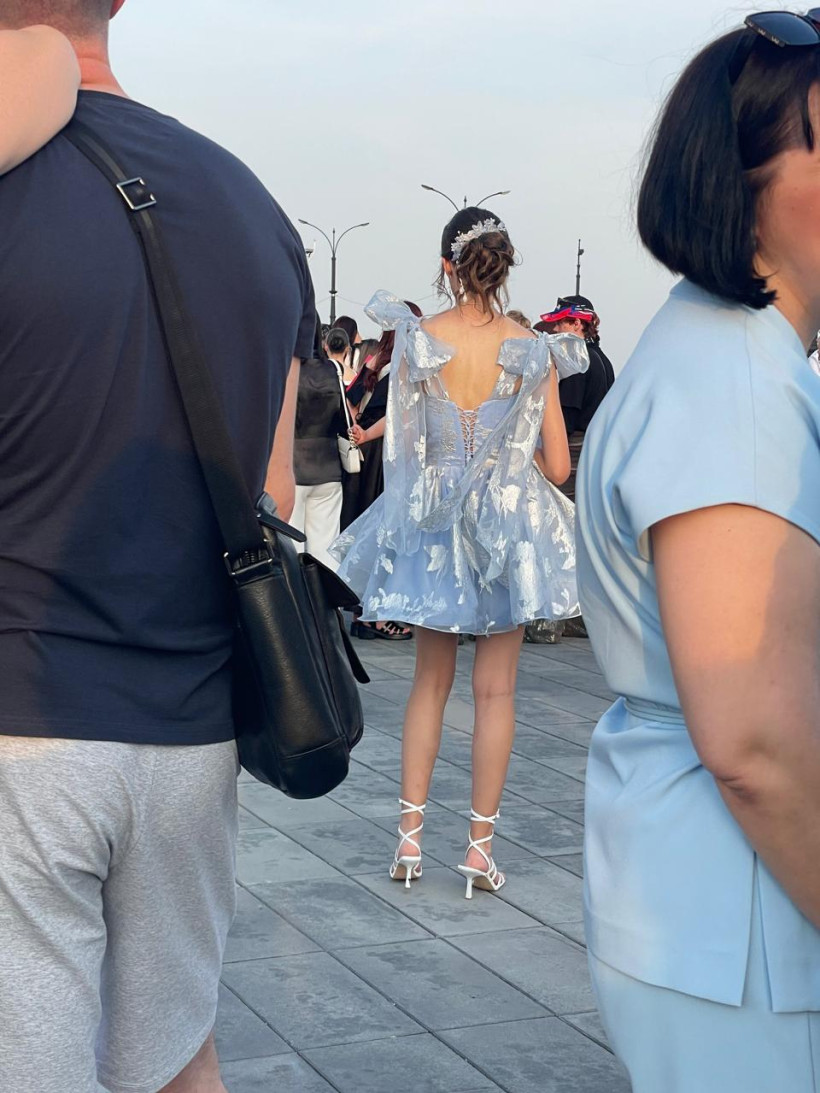 — На первый взгляд, это достаточно простое платье, но за счет нежно-голубого небесного цвета оно, безусловно, выигрывает. Девочка очень грамотно подобрала платье под тон своей кожи — она белокожая брюнетка. Плюс крой подчеркивает ее фигуру. Я очень люблю голубой цвет, он на протяжении нескольких сезонов всё еще в тренде, — признается радиоведущая, знающая толк в современной моде.