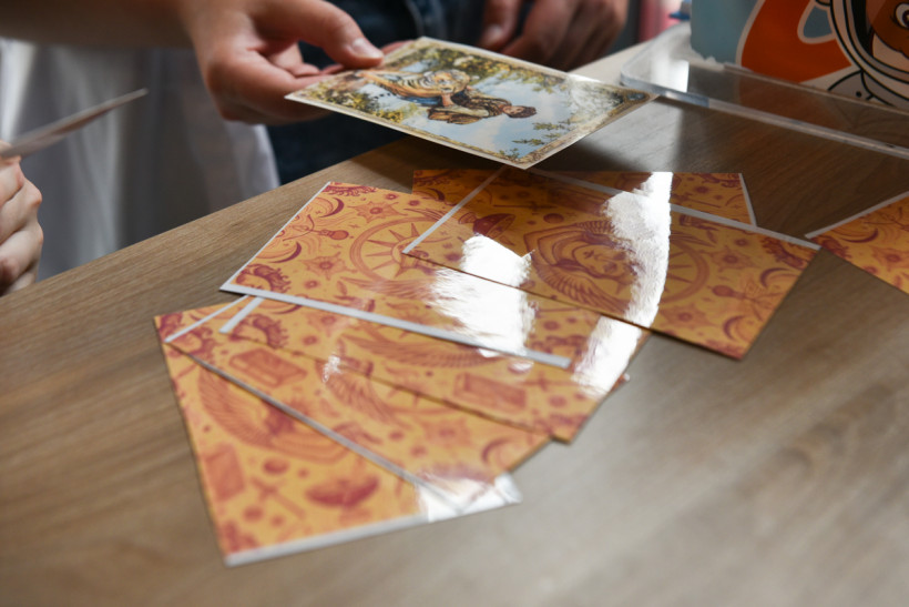 Пока мы разговариваем с Викторией, в павильон постоянно заходят люди. Суббота, День молодежи: кто‑то покупает воду, кто‑то — сувениры, молодежь заглядывает, чтобы вытянуть туристические карты Таро: акцию создали специально для праздника. Примерно через полчаса заходит женщина с конкретным запросом.