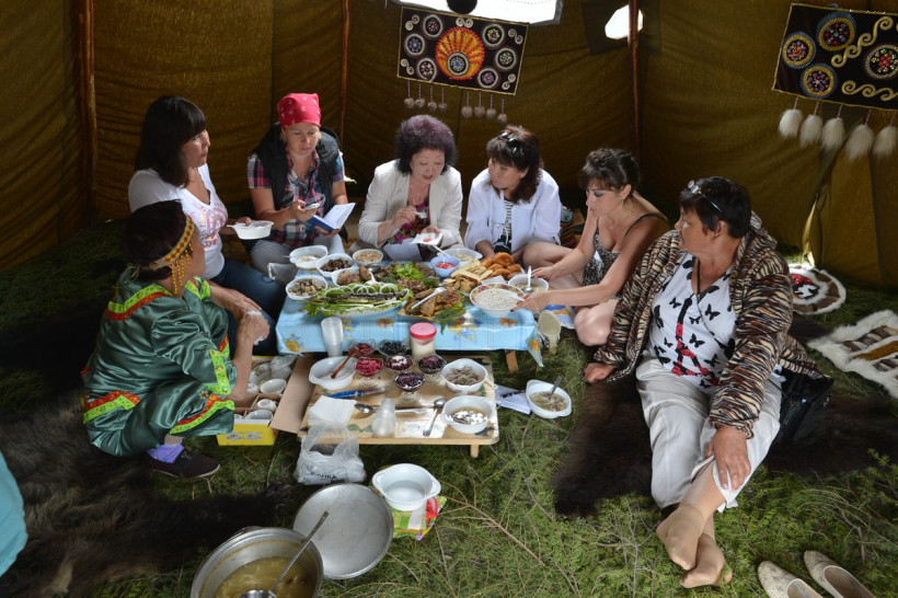 Местные жители встречали гостей в традиционных костюмах и угощали блюдами национальной кухни из мяса и рыбы. Эвенкийские умельцы продемонстрировали свое мастерство на выставке традиционного декоративно-прикладного искусства и в мастер-классах. Они изготовили обереги, унты, варежки и различные украшения.
