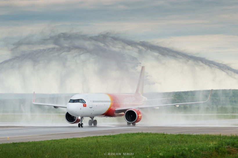 Первый рейс нового перевозчика из Вьетнама встретили в аэропорту Благовещенска водной аркой