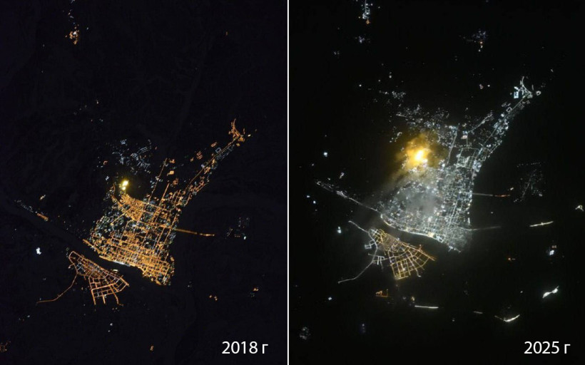 — Посмотрите на эти космоснимки 2018 и 2024 годов. Что бросается в глаза? — поинтересовался Василий Орлов и показал ночные фотографии Благовещенска и Хэйхэ.