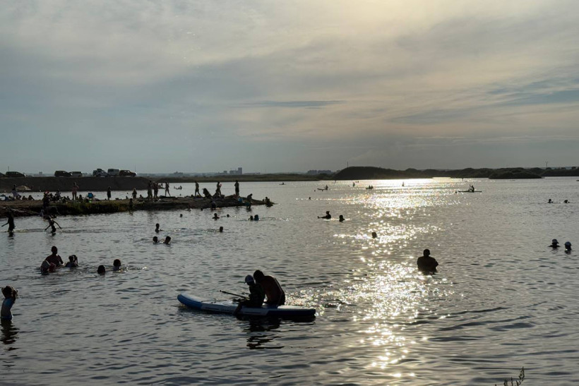 Чтобы припарковать машину на стихийной парковке, нужно основательно постараться. И это понятно — дорога по мосту комфортная, люди до нового места отдыха добираются почти на всех видах транспорта: велосипедах, мопедах, легковых автомобилях и грузовиках с прицепами. Кто-то приезжает на пару часов искупаться, а кто-то разбивает палаточный лагерь на выходные с шезлонгами, мангалами и даже баней. Прямо на берегу поздравляют с днем рождения, загорают, купаются, играют с детьми, но больше всего пловцов на сапах.